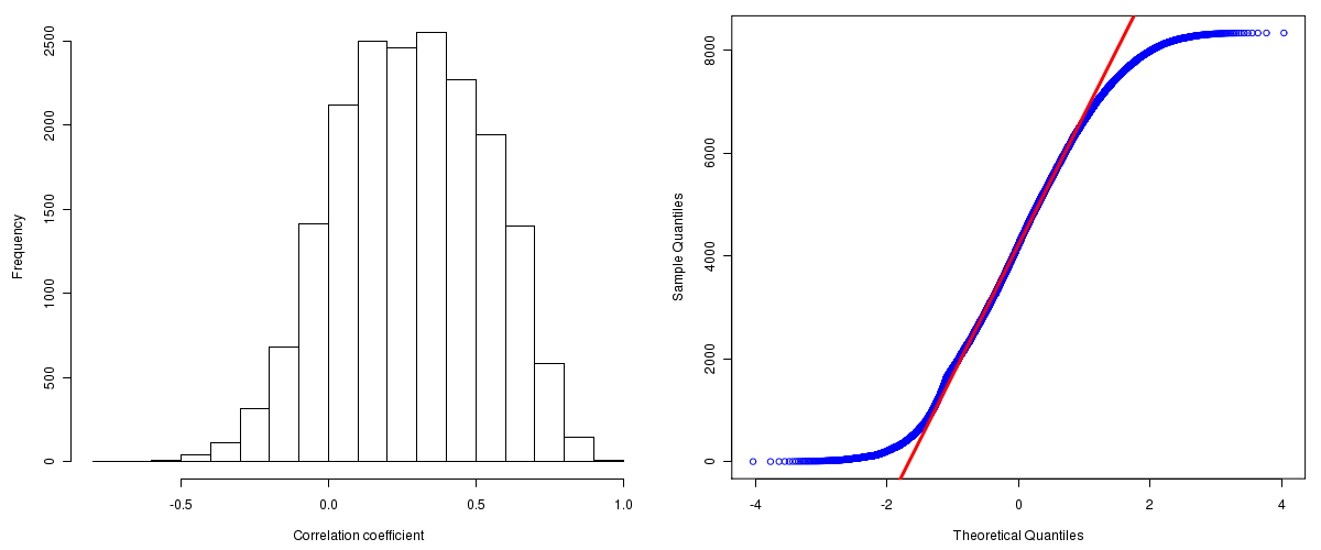 Figure 1. Summary figures. Left: histogram showing the distribution of the calculated correlations across samples for all Genes. Right: QQ plot of the calculated correlations across samples. The QQ plot is used to plot the quantiles of the calculated correlation coefficients against that derived from a normal distribution. Points deviating from the blue line indicate deviation from normality.