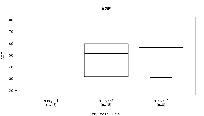 Table S2. Clustering Approach #1: 'MIRseq CNMF subtypes' versus Clinical Feature #1: 'AGE'