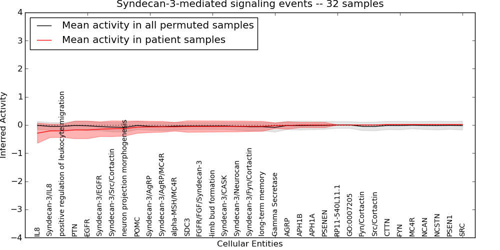Figure S131. Get High-res Image This plot shows pathway concept perturbations across all samples against a permutation model. The concepts along the x-axis are sorted by lowest to highest mean activity for the real patient samples. Mean inferred activities are plotted along the y-axis as a colored band showing the average level and one standard deviation range. Real samples are shown in red and permuted samples in black.