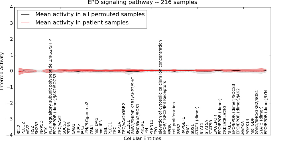 Figure S131. Get High-res Image This plot shows pathway concept perturbations across all samples against a permutation model. The concepts along the x-axis are sorted by lowest to highest mean activity for the real patient samples. Mean inferred activities are plotted along the y-axis as a colored band showing the average level and one standard deviation range. Real samples are shown in red and permuted samples in black.