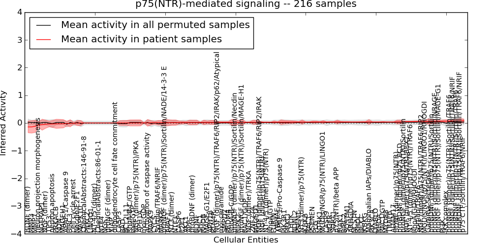 Figure S128. Get High-res Image This plot shows pathway concept perturbations across all samples against a permutation model. The concepts along the x-axis are sorted by lowest to highest mean activity for the real patient samples. Mean inferred activities are plotted along the y-axis as a colored band showing the average level and one standard deviation range. Real samples are shown in red and permuted samples in black.