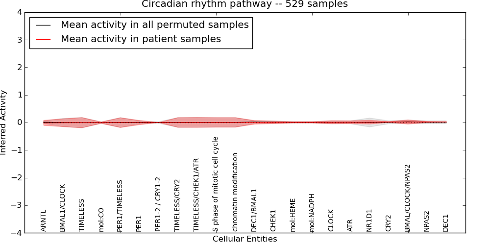 Figure S130. Get High-res Image This plot shows pathway concept perturbations across all samples against a permutation model. The concepts along the x-axis are sorted by lowest to highest mean activity for the real patient samples. Mean inferred activities are plotted along the y-axis as a colored band showing the average level and one standard deviation range. Real samples are shown in red and permuted samples in black.