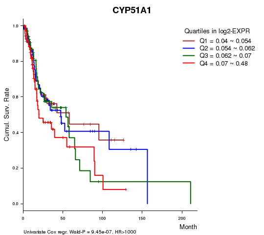 Figure S1. Get High-res Image As an example, this figure shows the association of CYP51A1 to 'Time to Death'. four curves present the cumulative survival rates of 4 quartile subsets of patients. P value = 9.45e-07 with univariate Cox regression analysis using continuous log-2 expression values.