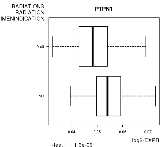 Figure S7. Get High-res Image As an example, this figure shows the association of PTPN1 to 'RADIATIONS.RADIATION.REGIMENINDICATION'. P value = 1.6e-06 with T-test analysis.