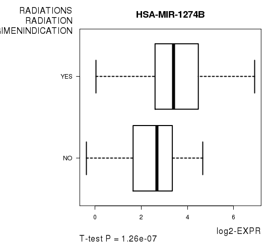 Figure S3. Get High-res Image As an example, this figure shows the association of HSA-MIR-1274B to 'RADIATIONS.RADIATION.REGIMENINDICATION'. P value = 1.26e-07 with T-test analysis.