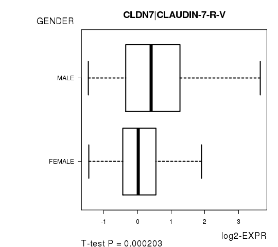 Figure S2. Get High-res Image As an example, this figure shows the association of CLDN7|CLAUDIN-7-R-V to 'GENDER'. P value = 0.000203 with T-test analysis.