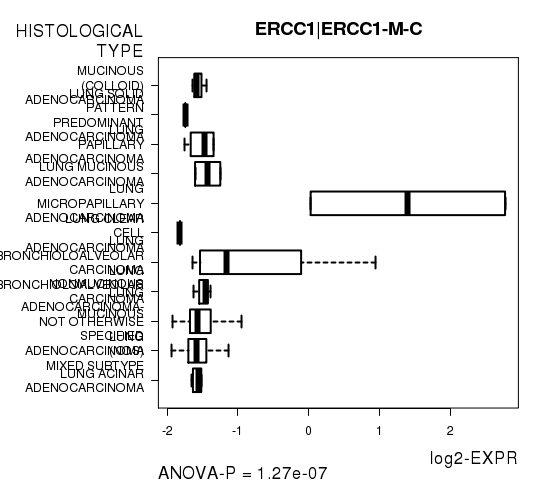 Figure S3. Get High-res Image As an example, this figure shows the association of ERCC1|ERCC1-M-C to 'HISTOLOGICAL.TYPE'. P value = 1.27e-07 with ANOVA analysis.
