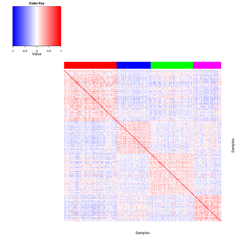 Figure 1. Get High-res Image Samples were separated into 4 clusters. Shown are 250 samples and 1200 marker genes. The color bar of the row indicates the marker genes for the corresponding cluster.