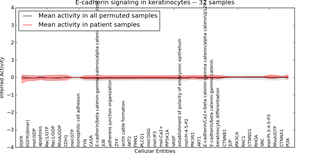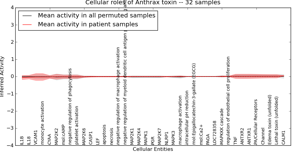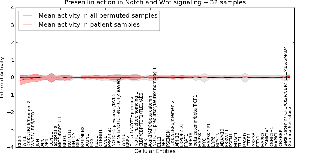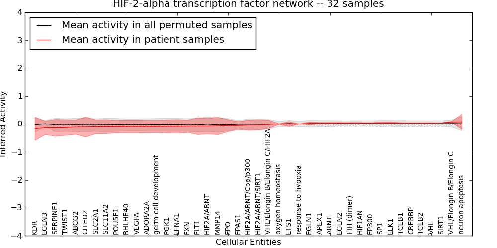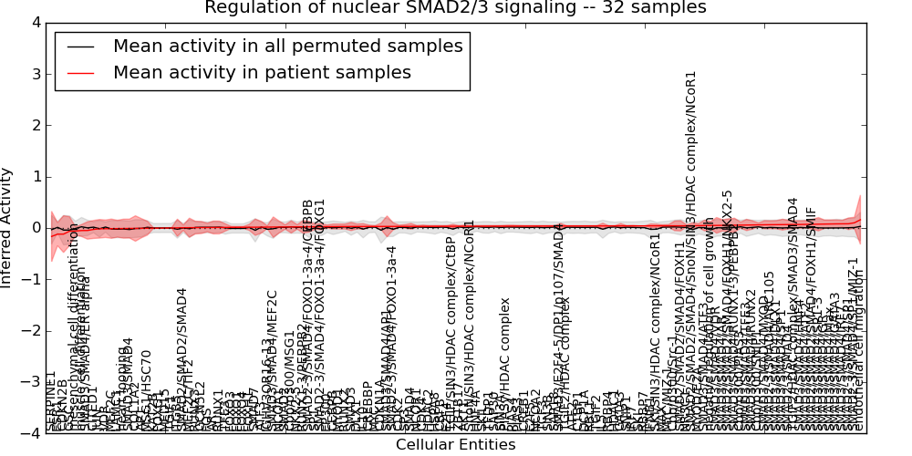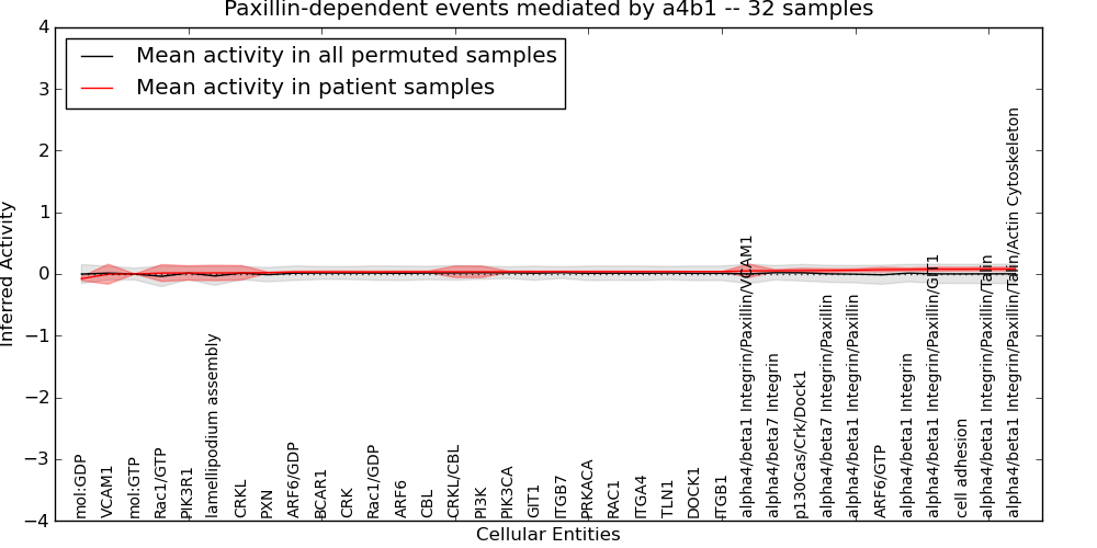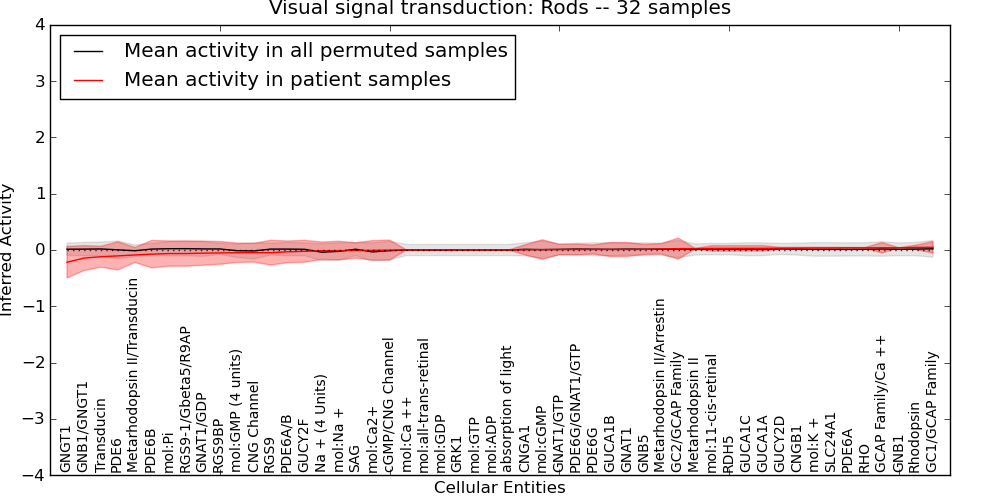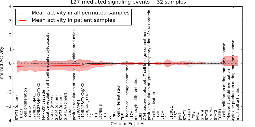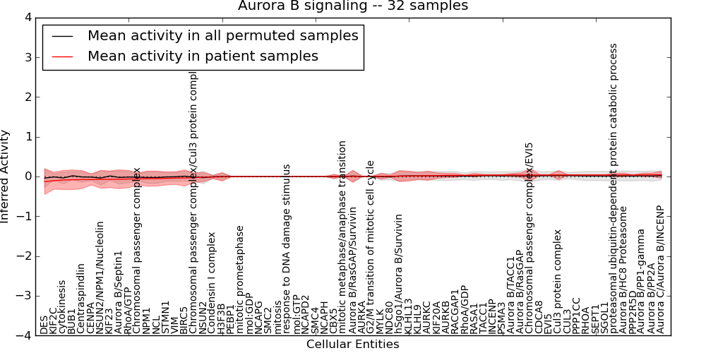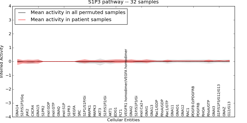 Figure S131. Get High-res Image This plot shows pathway concept perturbations across all samples against a permutation model. The concepts along the x-axis are sorted by lowest to highest mean activity for the real patient samples. Mean inferred activities are plotted along the y-axis as a colored band showing the average level and one standard deviation range. Real samples are shown in red and permuted samples in black.