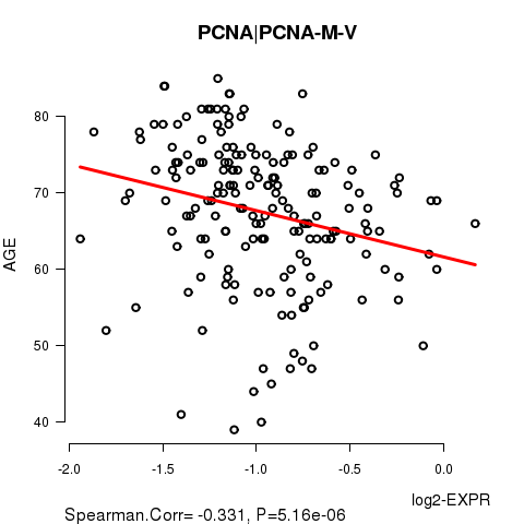 Figure S2. Get High-res Image As an example, this figure shows the association of PCNA|PCNA-M-V to 'AGE'. P value = 5.16e-06 with Spearman correlation analysis. The straight line presents the best linear regression.