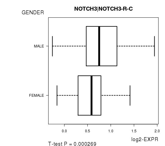 Figure S3. Get High-res Image As an example, this figure shows the association of NOTCH3|NOTCH3-R-C to 'GENDER'. P value = 0.000269 with T-test analysis.