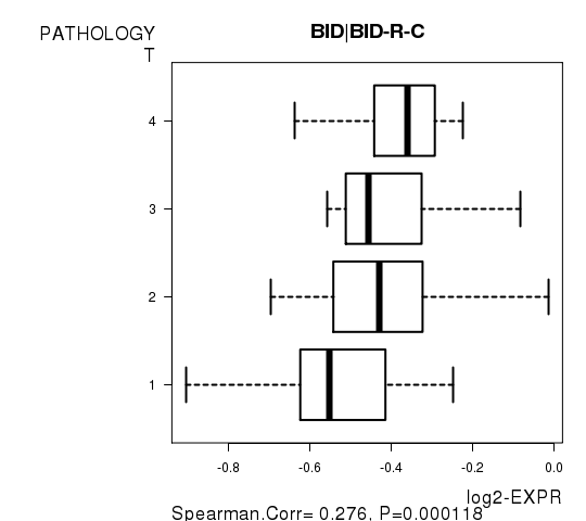 Figure S5. Get High-res Image As an example, this figure shows the association of BID|BID-R-C to 'PATHOLOGY.T'. P value = 0.000118 with Spearman correlation analysis.
