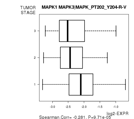 Figure S7. Get High-res Image As an example, this figure shows the association of MAPK1 MAPK3|MAPK_PT202_Y204-R-V to 'TUMOR.STAGE'. P value = 9.71e-05 with Spearman correlation analysis.