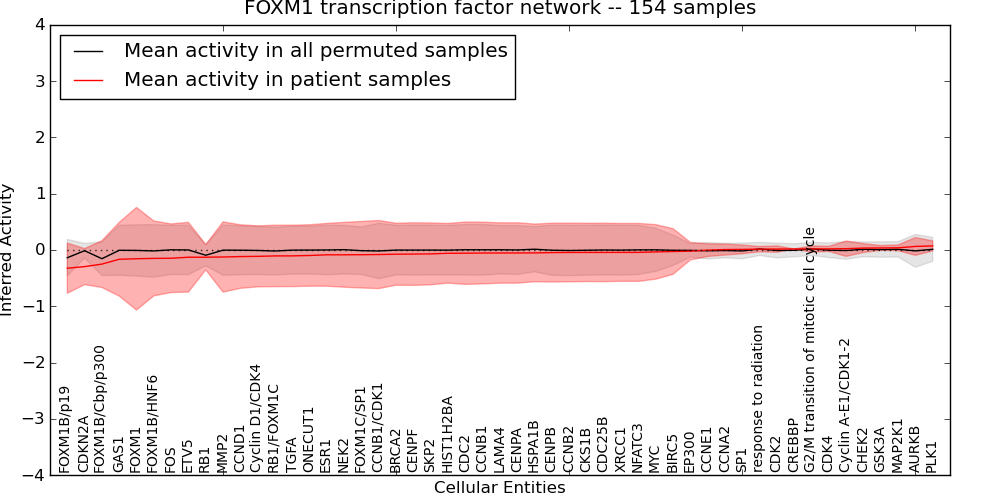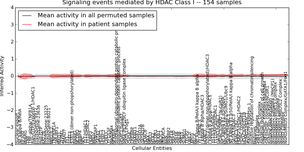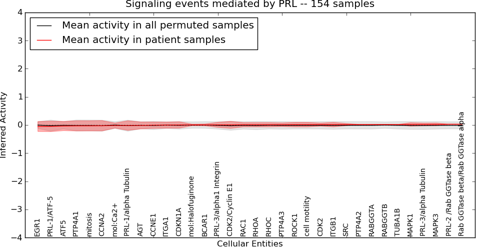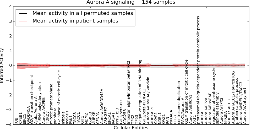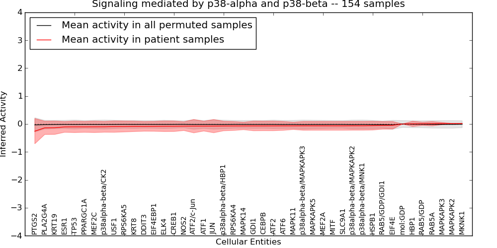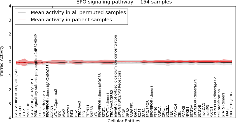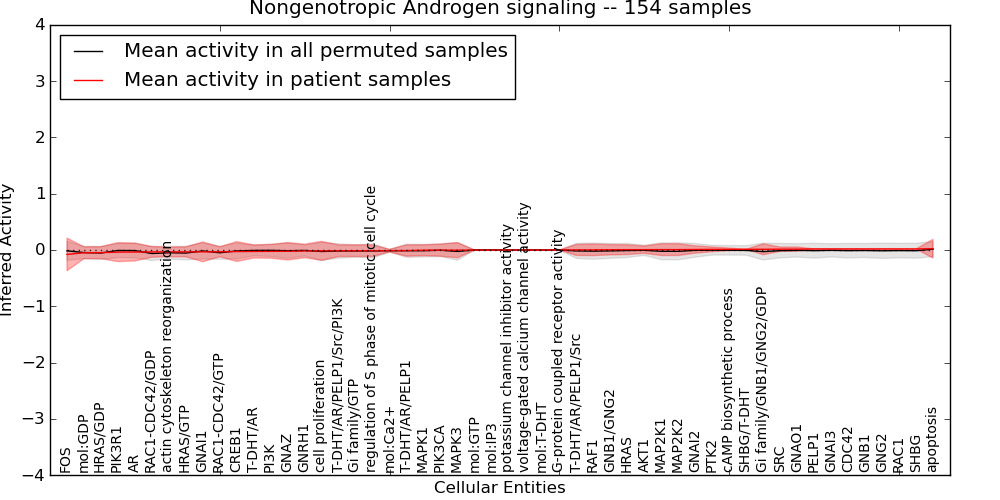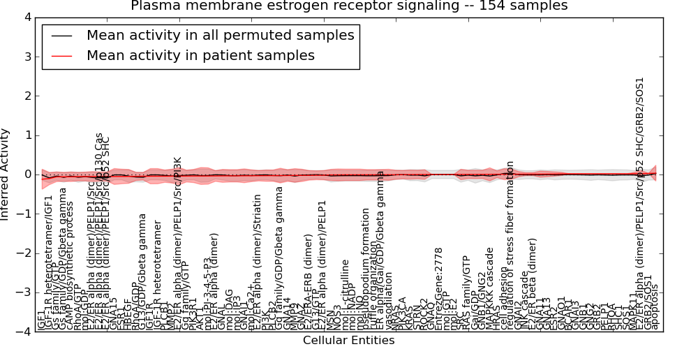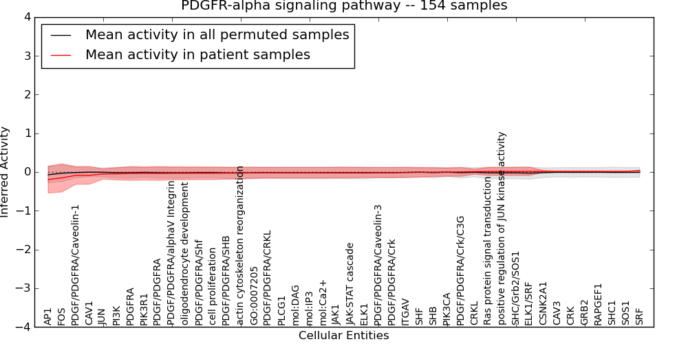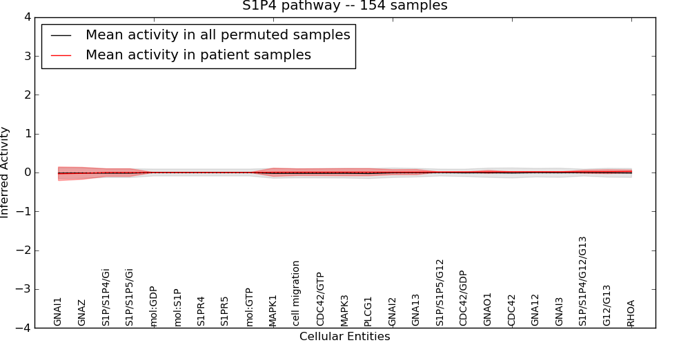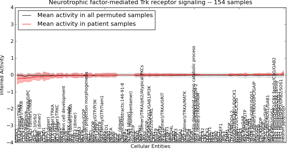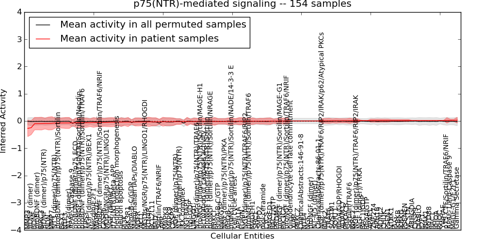 Figure S131. Get High-res Image This plot shows pathway concept perturbations across all samples against a permutation model. The concepts along the x-axis are sorted by lowest to highest mean activity for the real patient samples. Mean inferred activities are plotted along the y-axis as a colored band showing the average level and one standard deviation range. Real samples are shown in red and permuted samples in black.