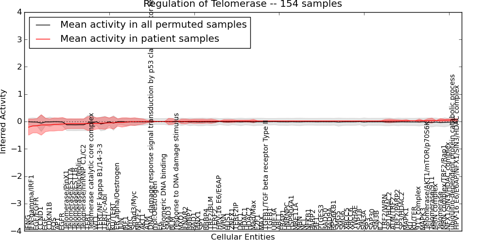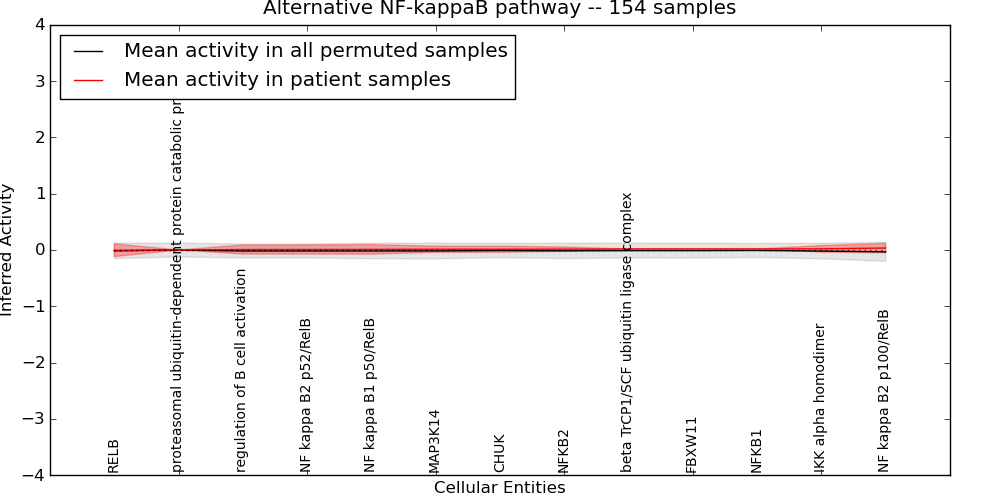 Figure S130. Get High-res Image This plot shows pathway concept perturbations across all samples against a permutation model. The concepts along the x-axis are sorted by lowest to highest mean activity for the real patient samples. Mean inferred activities are plotted along the y-axis as a colored band showing the average level and one standard deviation range. Real samples are shown in red and permuted samples in black.
