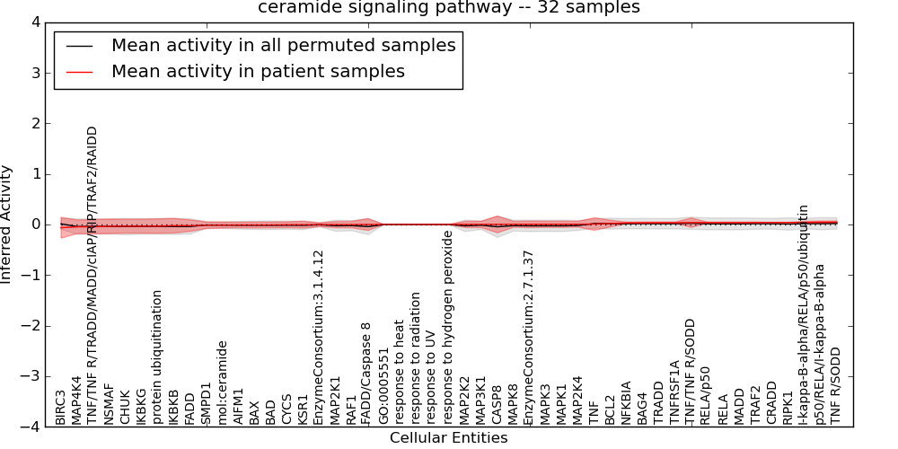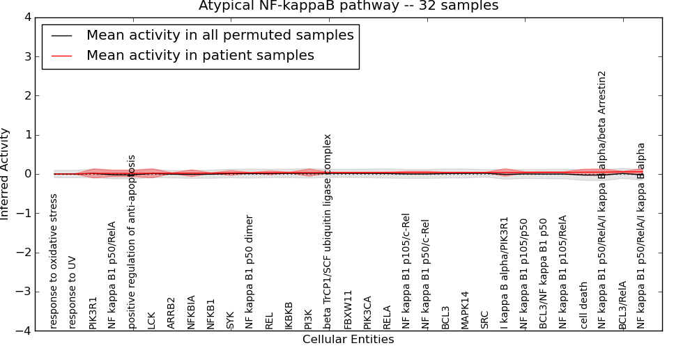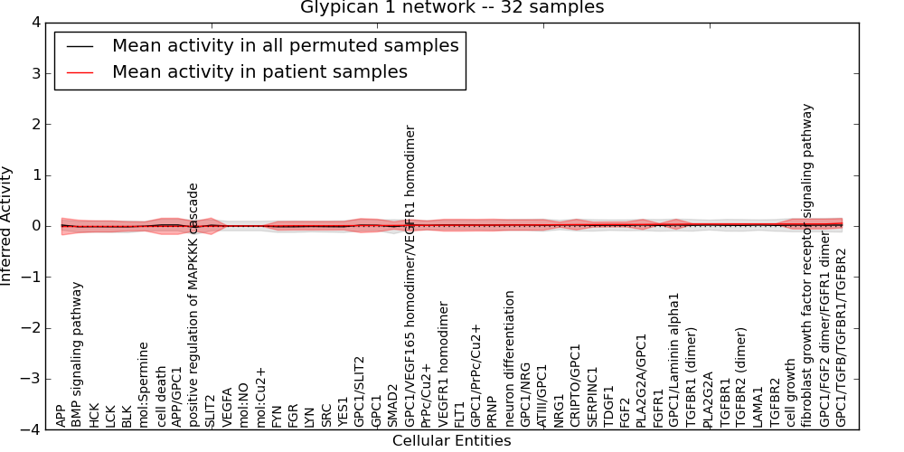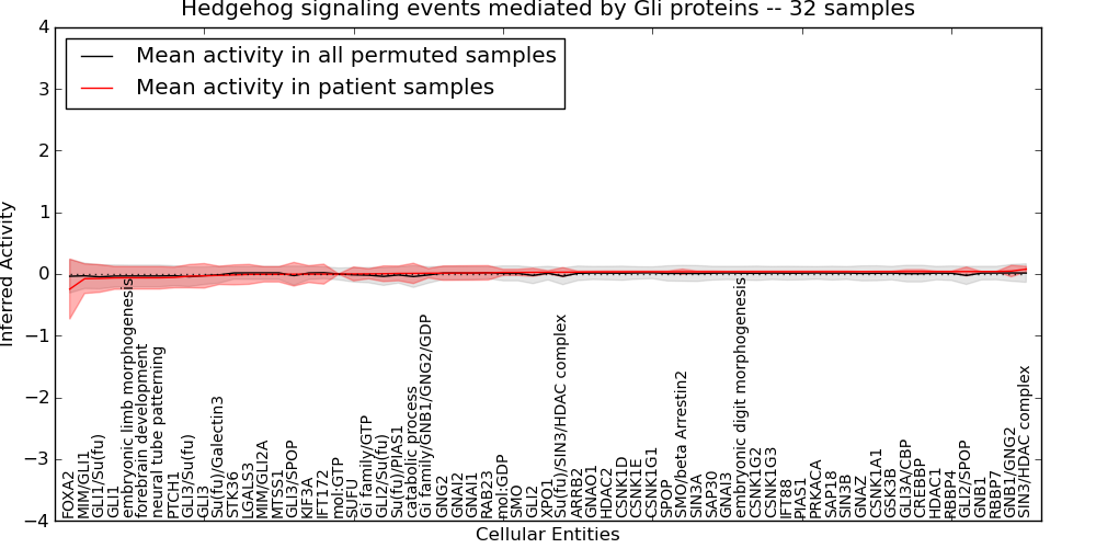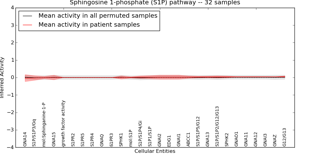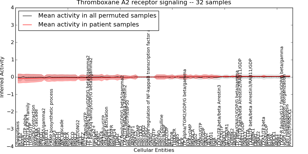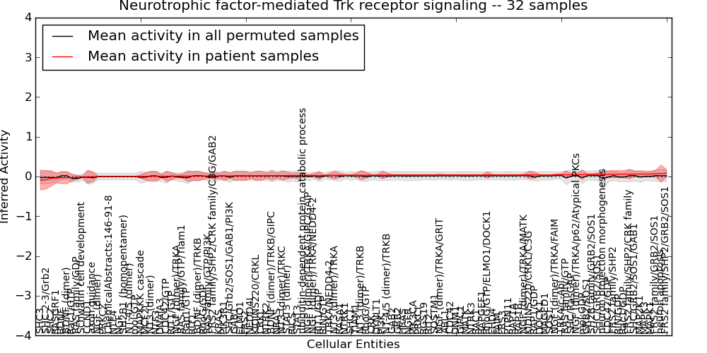Figure S131. Get High-res Image This plot shows pathway concept perturbations across all samples against a permutation model. The concepts along the x-axis are sorted by lowest to highest mean activity for the real patient samples. Mean inferred activities are plotted along the y-axis as a colored band showing the average level and one standard deviation range. Real samples are shown in red and permuted samples in black.