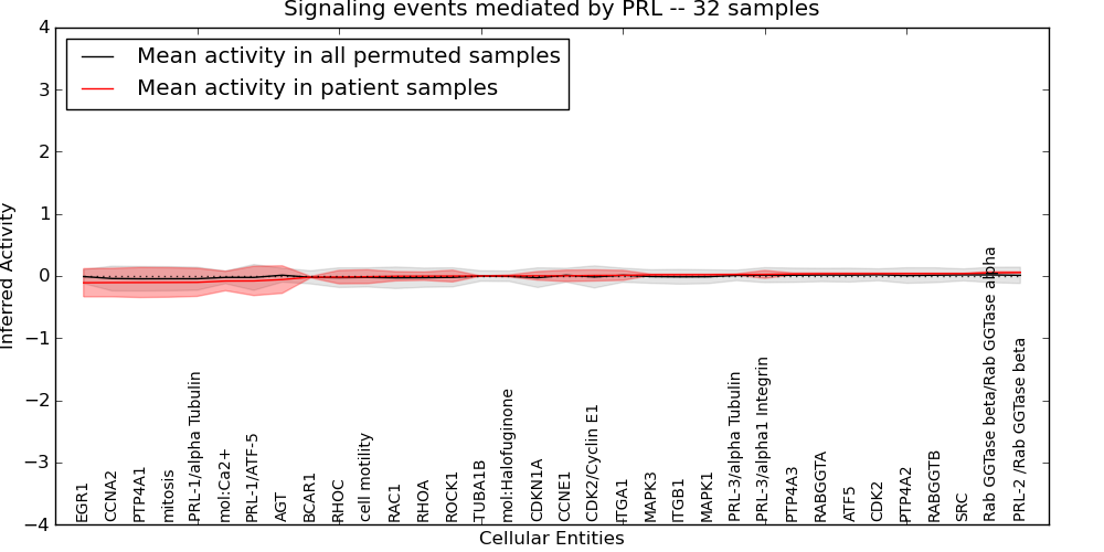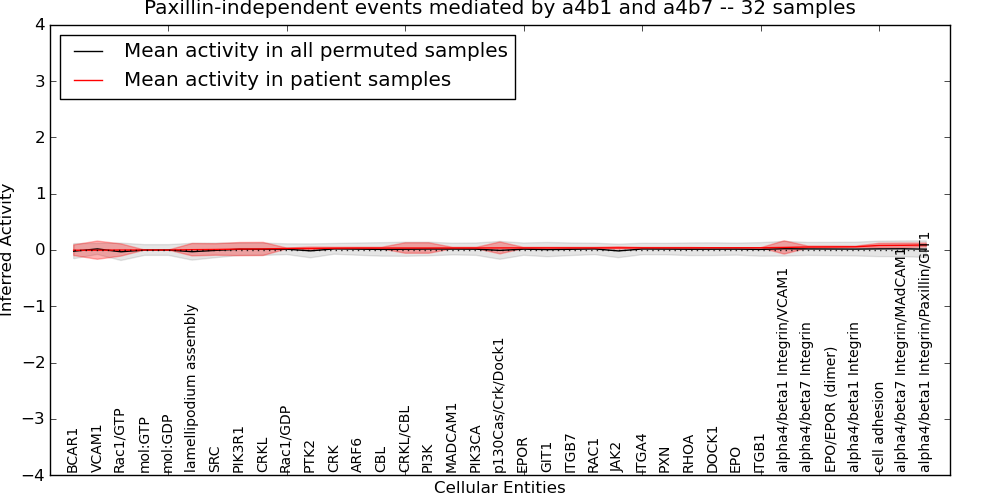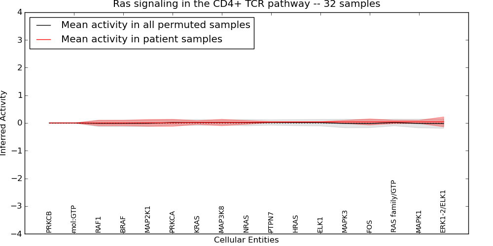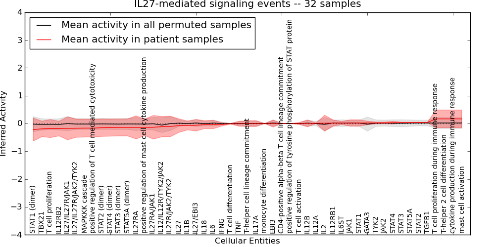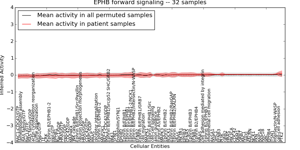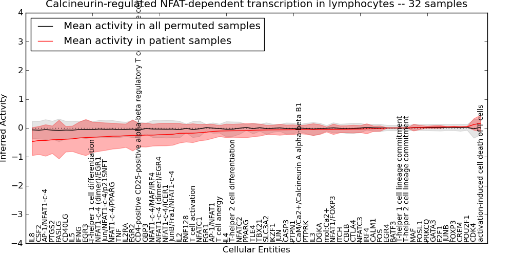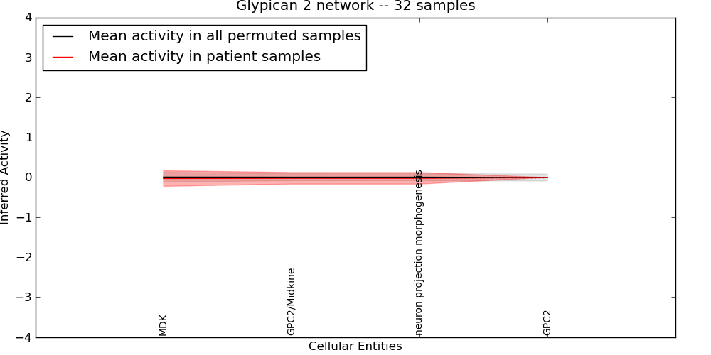 Figure S131. Get High-res Image This plot shows pathway concept perturbations across all samples against a permutation model. The concepts along the x-axis are sorted by lowest to highest mean activity for the real patient samples. Mean inferred activities are plotted along the y-axis as a colored band showing the average level and one standard deviation range. Real samples are shown in red and permuted samples in black.