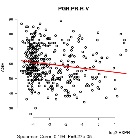 Figure S2.  Get High-res Image As an example, this figure shows the association of PGR|PR-R-V to 'AGE'. P value = 9.27e-05 with Spearman correlation analysis. The straight line presents the best linear regression.