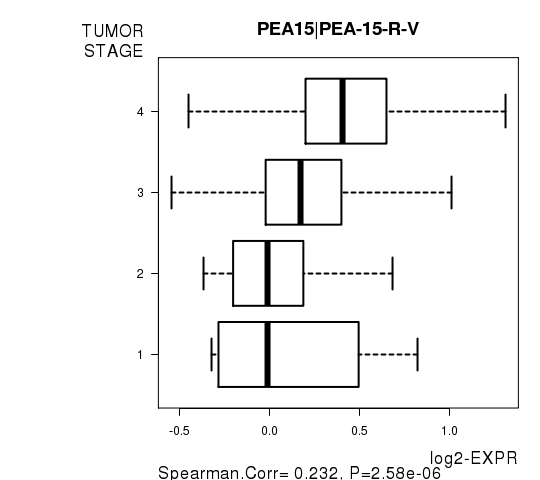 Figure S3.  Get High-res Image As an example, this figure shows the association of PEA15|PEA-15-R-V to 'TUMOR.STAGE'. P value = 2.58e-06 with Spearman correlation analysis.