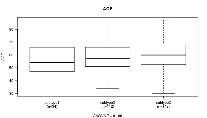 Table S83. Clustering Approach #11: 'MIRseq CNMF subtypes' versus Clinical Feature #2: 'AGE'