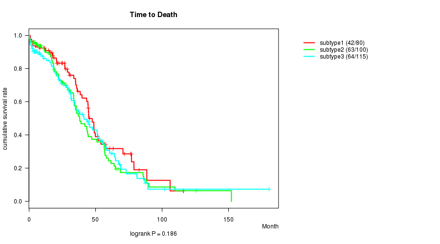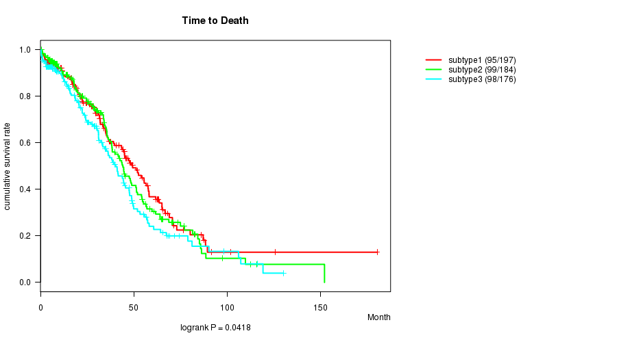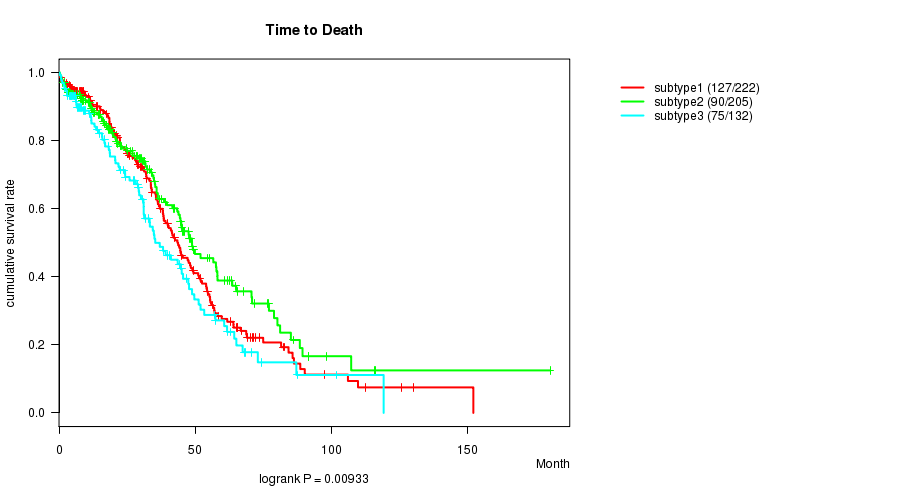 Consensus hierarchical clustering analysis on array-based miR expression data identified 3 subtypes that correlate to 'Time to Death'.