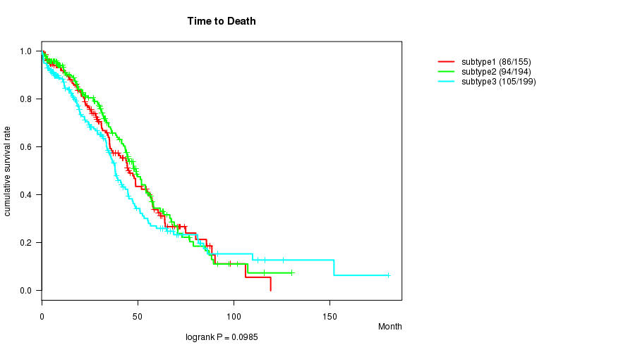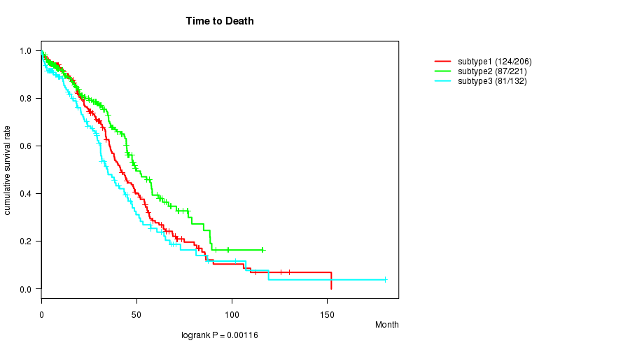 CNMF clustering analysis on array-based mRNA expression data identified 3 subtypes that correlate to 'Time to Death' and 'TUMOR.STAGE'.