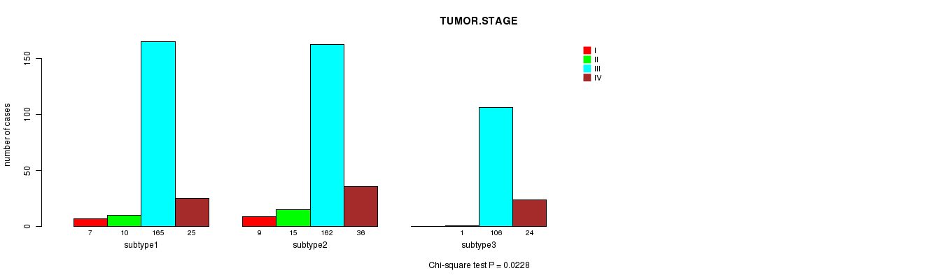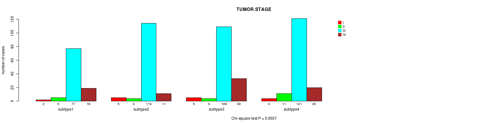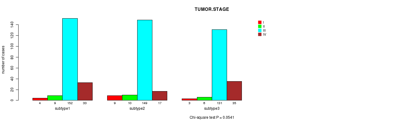 Figure S5. Get High-res Image Clustering Approach #1: 'mRNA CNMF subtypes' versus Clinical Feature #5: 'TUMOR.STAGE'
