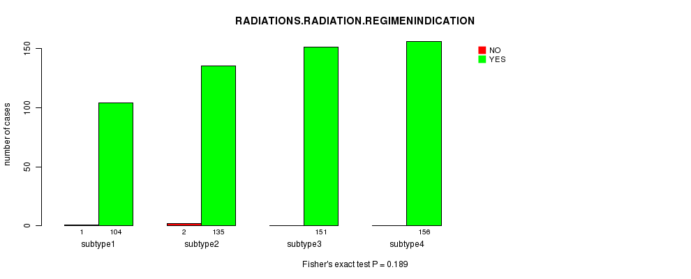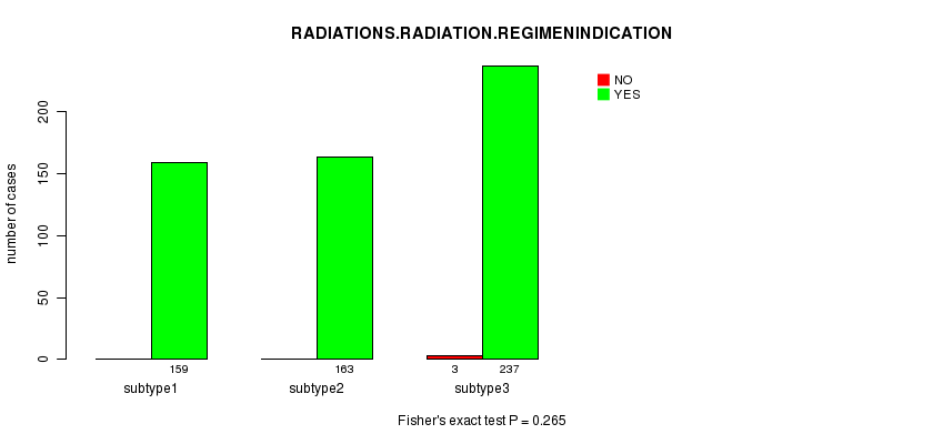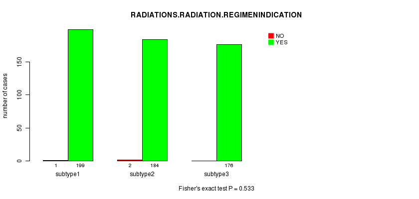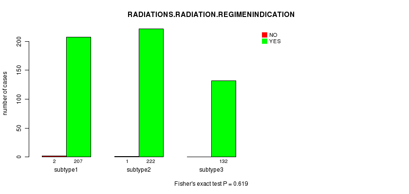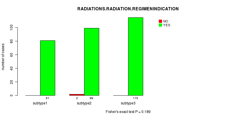 Figure S6. Get High-res Image Clustering Approach #1: 'mRNA CNMF subtypes' versus Clinical Feature #6: 'RADIATIONS.RADIATION.REGIMENINDICATION'