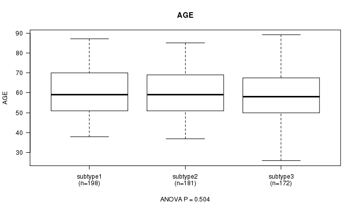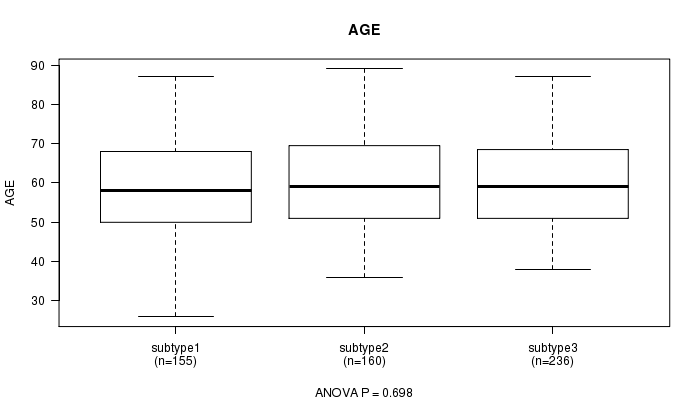 Table S3. Clustering Approach #1: 'mRNA CNMF subtypes' versus Clinical Feature #2: 'AGE'