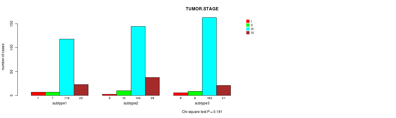 Consensus hierarchical clustering analysis on sequencing-based mRNA expression data identified 3 subtypes that correlate to 'TUMOR.STAGE'.