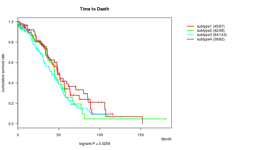 Figure S71. Get High-res Image Clustering Approach #11: 'MIRseq CNMF subtypes' versus Clinical Feature #1: 'Time to Death'