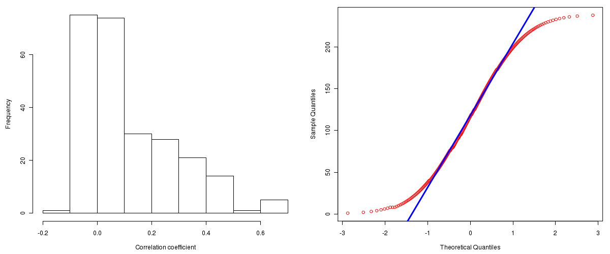 Number of genes and samples used for the calculation are shown in Table 1. Figure 1 shows the distribution of calculated correlation coefficients and quantile-quantile plot of the calculated correlation coefficients against a normal distribution. Table 2 shows the top 20 features ordered by the value of correlation coefficients.