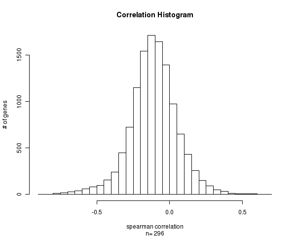 Figure 1. Histogram of methylation correlation values. n is the number of matched samples between Level 3 CpG site methylation and Level 3 gene expression arrays. Number of Matched Samples = 296