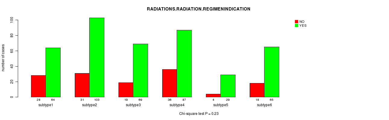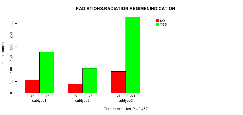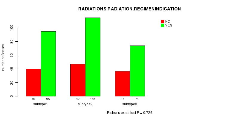 Figure S39. Get High-res Image Clustering Approach #8: 'RNAseq cHierClus subtypes' versus Clinical Feature #4: 'RADIATIONS.RADIATION.REGIMENINDICATION'