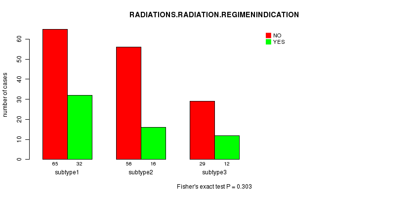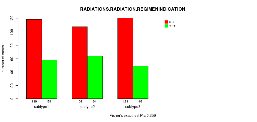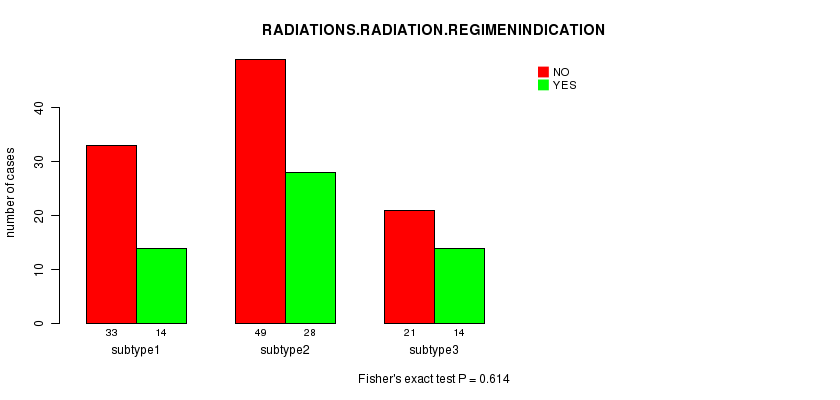 Figure S59. Get High-res Image Clustering Approach #10: 'RNAseq cHierClus subtypes' versus Clinical Feature #5: 'RADIATIONS.RADIATION.REGIMENINDICATION'