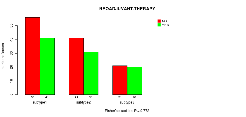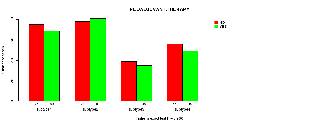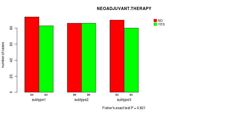 Figure S54. Get High-res Image Clustering Approach #9: 'RNAseq CNMF subtypes' versus Clinical Feature #6: 'NEOADJUVANT.THERAPY'