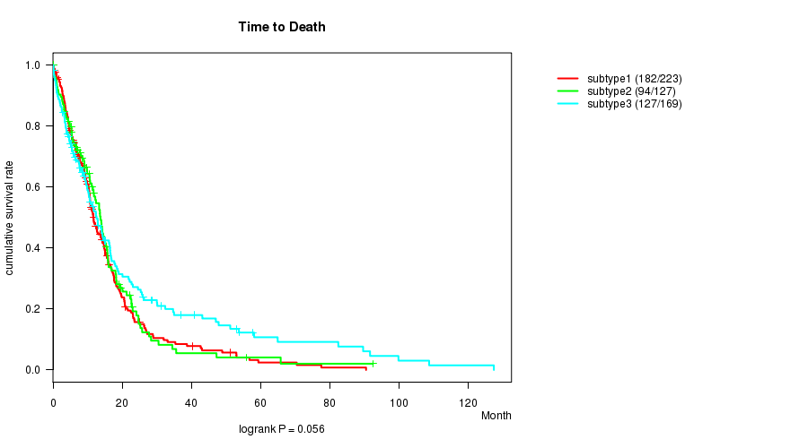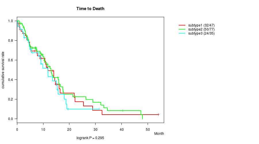 Consensus hierarchical clustering analysis on array-based miR expression data identified 3 subtypes that correlate to 'Time to Death' and 'AGE'.