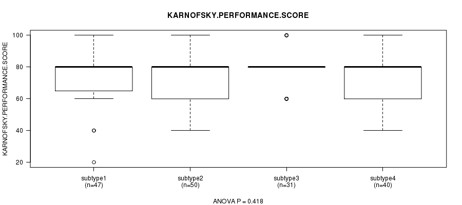 Figure S58. Get High-res Image Clustering Approach #10: 'RNAseq cHierClus subtypes' versus Clinical Feature #4: 'KARNOFSKY.PERFORMANCE.SCORE'