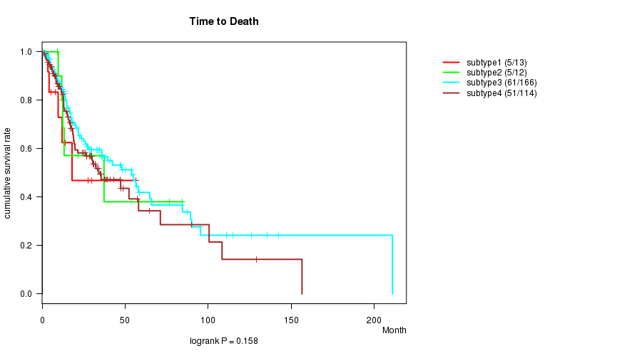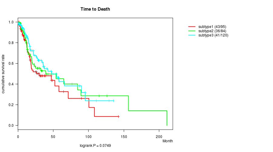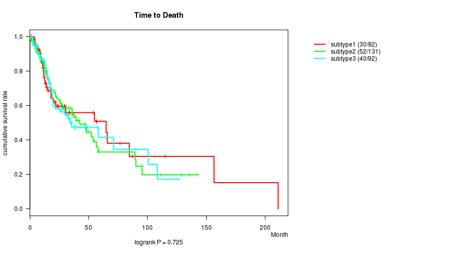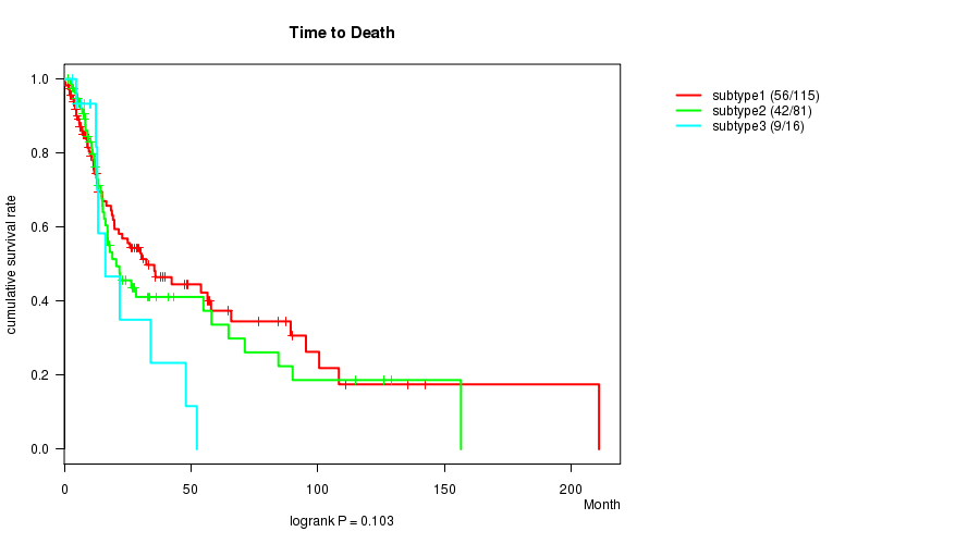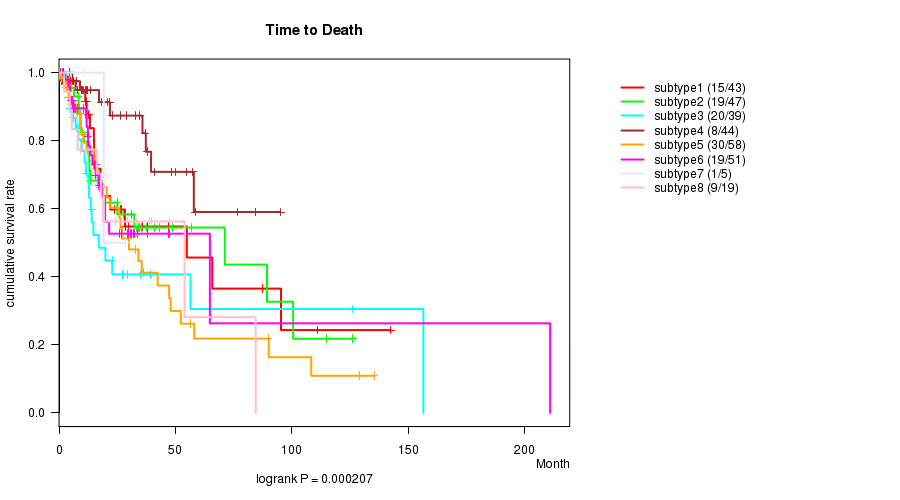 | Time to Death | logrank test | 0.000207 | 0.0351 | 0.103 | 0.205 | 0.0749 | 0.725 | 0.158 |