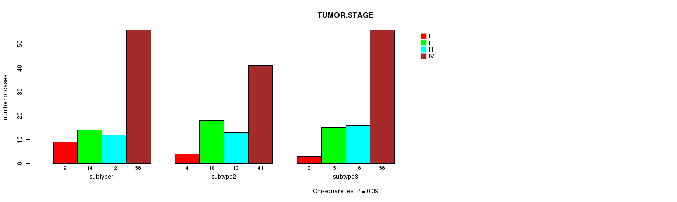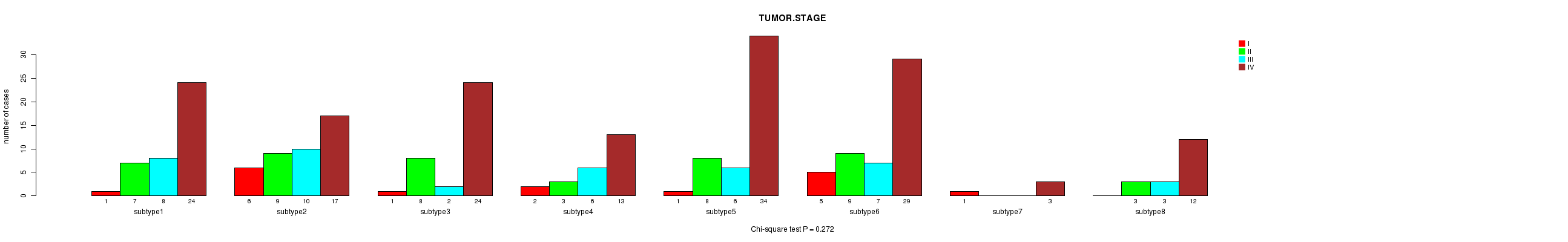 Figure S46. Get High-res Image Clustering Approach #6: 'MIRseq CNMF subtypes' versus Clinical Feature #6: 'TUMOR.STAGE'