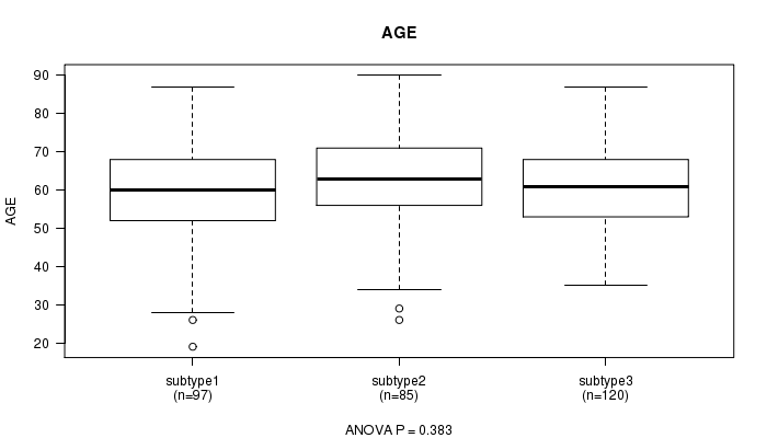For continuous numerical clinical features, one-way analysis of variance (Howell 2002) was applied to compare the clinical values between tumor subtypes using 'anova' function in R