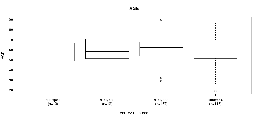 Table S57. Clustering Approach #7: 'MIRseq cHierClus subtypes' versus Clinical Feature #2: 'AGE'