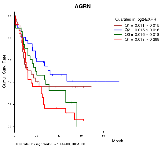 Figure S1. Get High-res Image As an example, this figure shows the association of AGRN to 'Time to Death'. four curves present the cumulative survival rates of 4 quartile subsets of patients. P value = 1.44e-09 with univariate Cox regression analysis using continuous log-2 expression values.