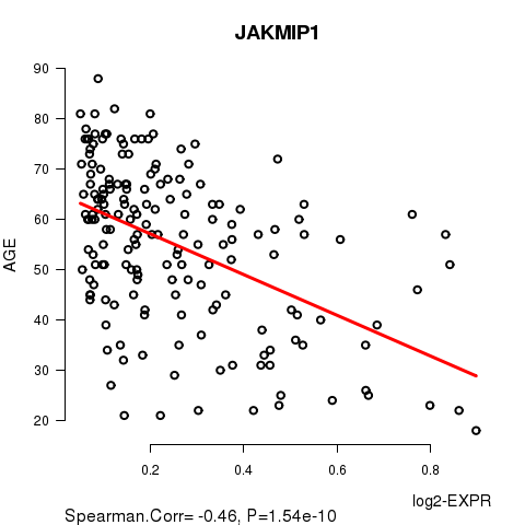 Figure S2. Get High-res Image As an example, this figure shows the association of JAKMIP1 to 'AGE'. P value = 1.54e-10 with Spearman correlation analysis. The straight line presents the best linear regression.