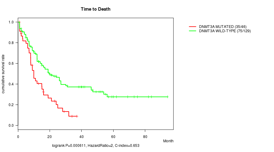 Figure S2. Get High-res Image Gene #6: 'DNMT3A MUTATION STATUS' versus Clinical Feature #1: 'Time to Death'