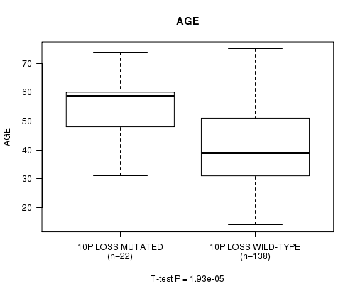 Table S7. Gene #34: '10p loss mutation analysis' versus Clinical Feature #2: 'AGE'