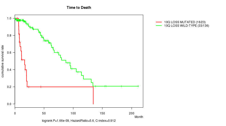 Table S8. Gene #35: '10q loss mutation analysis' versus Clinical Feature #1: 'Time to Death'