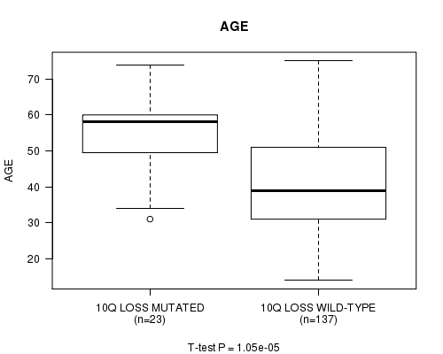 Figure S9. Get High-res Image Gene #35: '10q loss mutation analysis' versus Clinical Feature #2: 'AGE'