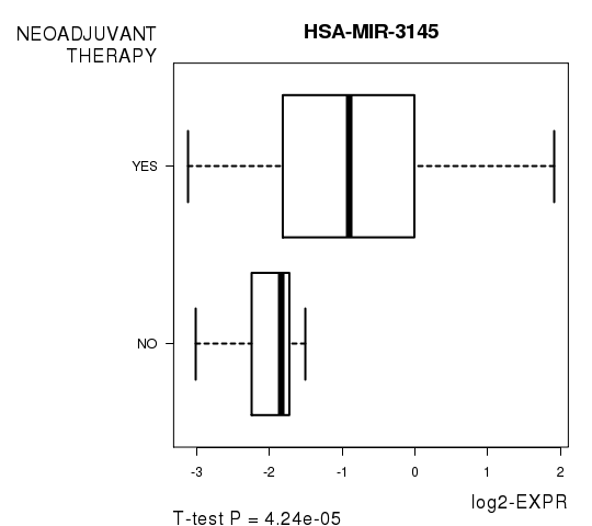 Figure S5. Get High-res Image As an example, this figure shows the association of HSA-MIR-3145 to 'NEOADJUVANT.THERAPY'. P value = 4.24e-05 with T-test analysis.