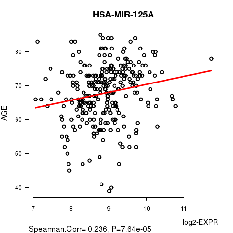 Figure S1. Get High-res Image As an example, this figure shows the association of HSA-MIR-125A to 'AGE'. P value = 7.64e-05 with Spearman correlation analysis. The straight line presents the best linear regression.